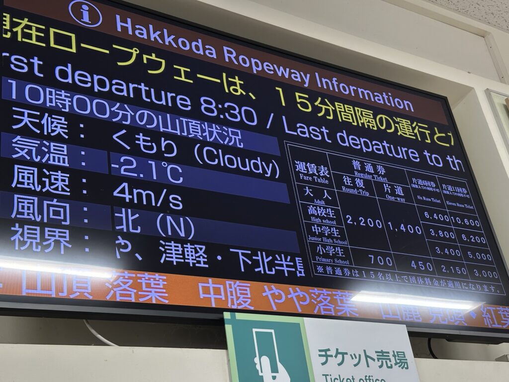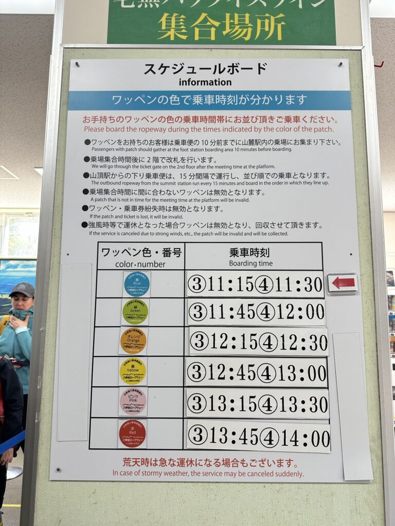 ロープウェイは上下線ともに毎時00、15、30、45分発の15分間隔での運行をしています。