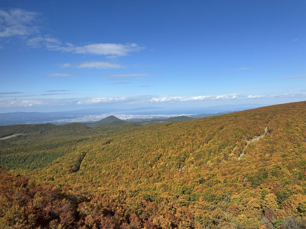 中腹を過ぎる頃には、向こうの方には津軽半島と下北半島が見えてきます。