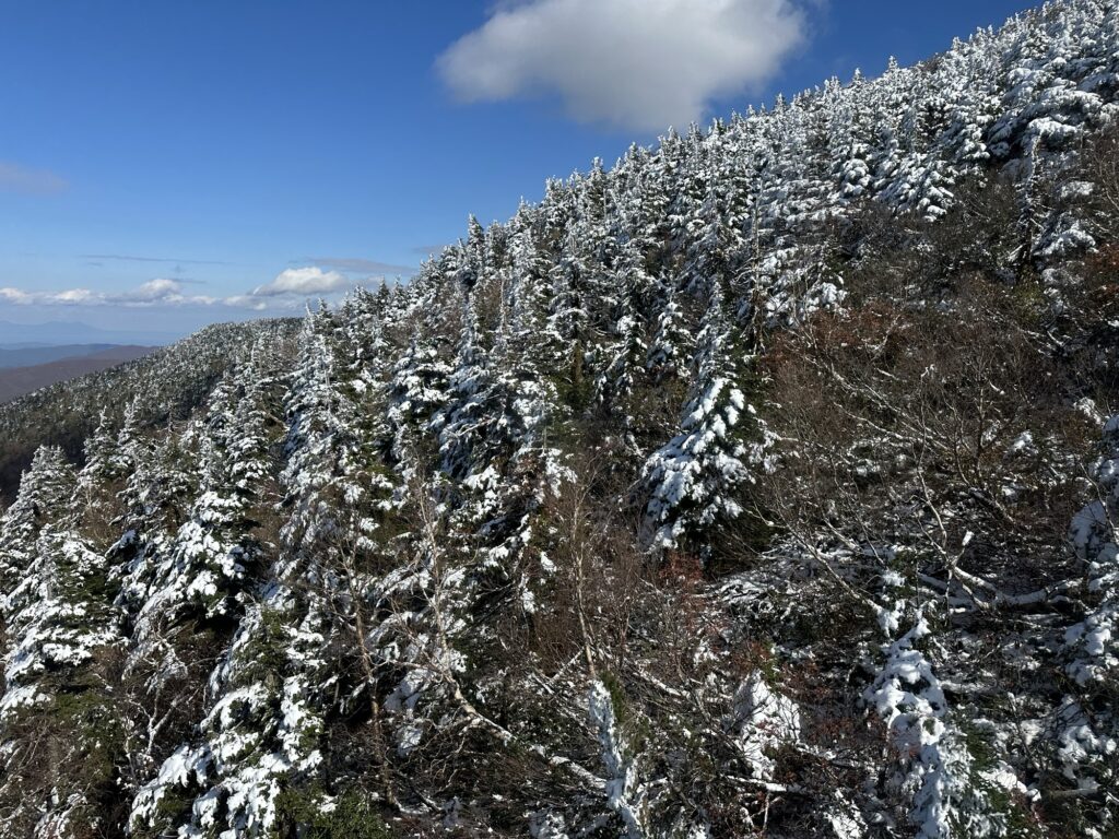 山頂が近くなると、木々の紅葉は終わり、雪が見られるようになります。約10分でこの雪景色。山頂はもう冬です。