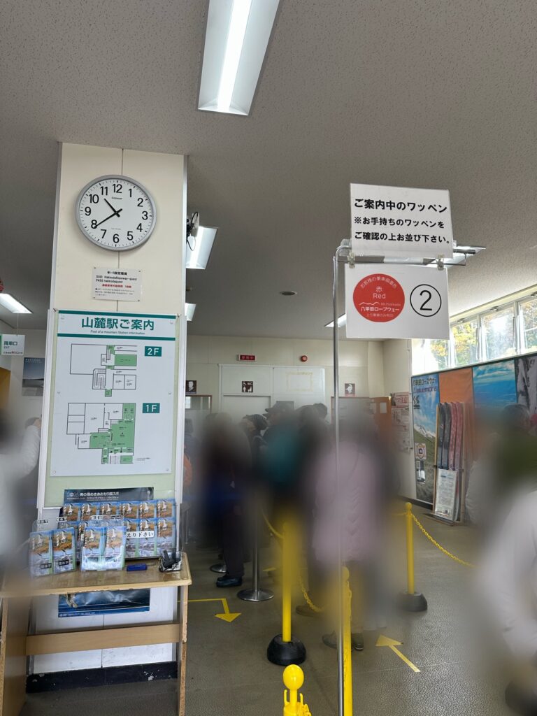 乗車時間の10〜15分前になったら、館内外にワッペンの色と乗車時間のアナウンスが入ります。(日本語)