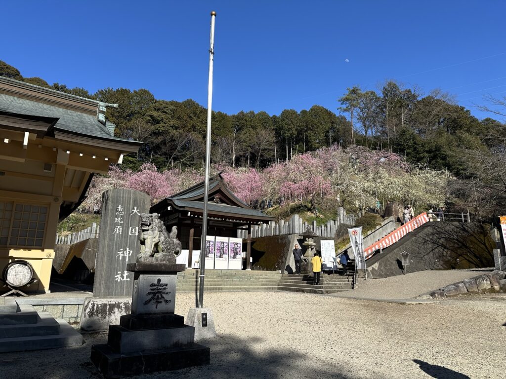 梅の見頃時期は空気もやわらかく、春の訪れを感じられる季節。神社の静かな雰囲気と、山肌いっぱいに広がるしだれ梅の華やかさの対比も印象的でした。