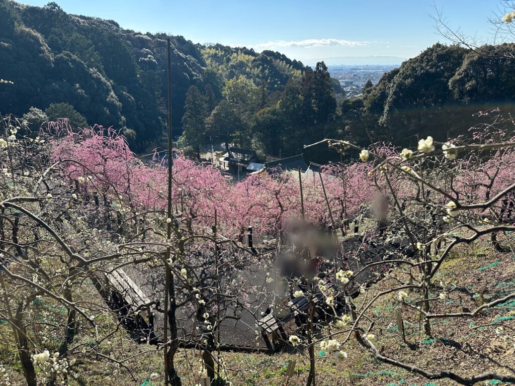 歴史ある神社の厳かな空気と、山肌いっぱいに広がるやわらかな梅の彩り。